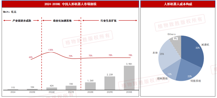 人形机械人成本形成:机械人焦点零部件次要包罗减速机、伺服电机、节制器等,此中减速机是机械人出产中壁垒最高的零部件。2024-2025财产链逐渐成熟:市场需求逐渐,手艺不竭冲破,手艺溢价逐渐衰退,保守工业机械人企业加快入局,鞭策手艺快速迭代取成本优化。2026-2027贸易化加快落地:规模化效应鞭策零部件成本下降,鞭策人形机械人的价钱下降,加快其正在工业、办事等场景的贸易化落地。2028-2030行业生态扩张:保守工业机械人企业、零部件供应商、AI算法公司等协同合做,财产链不竭完美,通用手艺平台和接口的成熟将降低开辟门槛,吸引更多新厂商进入。
